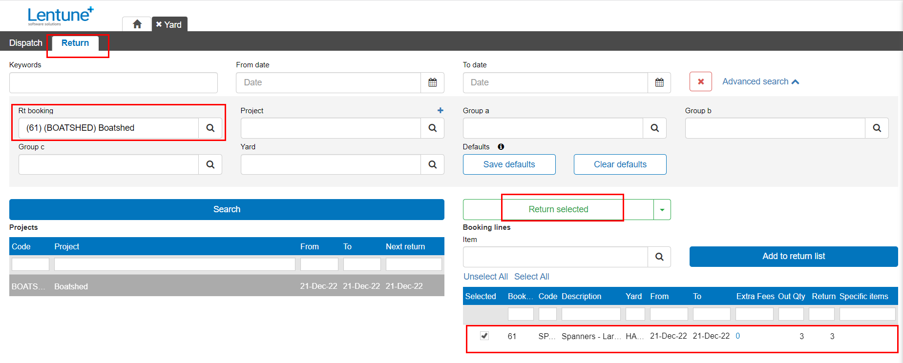 In the Booking Lines section on the right, you can now select the specific items that you want to return, by selecting their unique identifier codes.