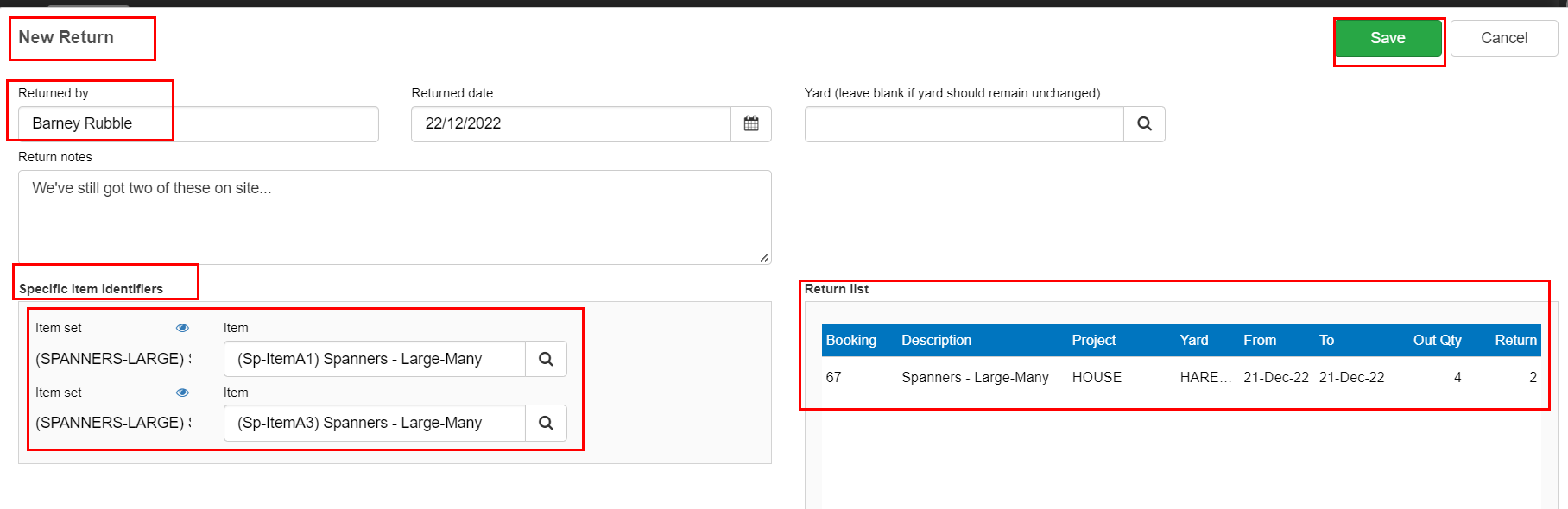 In the Specific item identifiers section, you will see each of the units that have been dispatched. In the Return list section, you can see the number of units that were booked out, and the number returned.