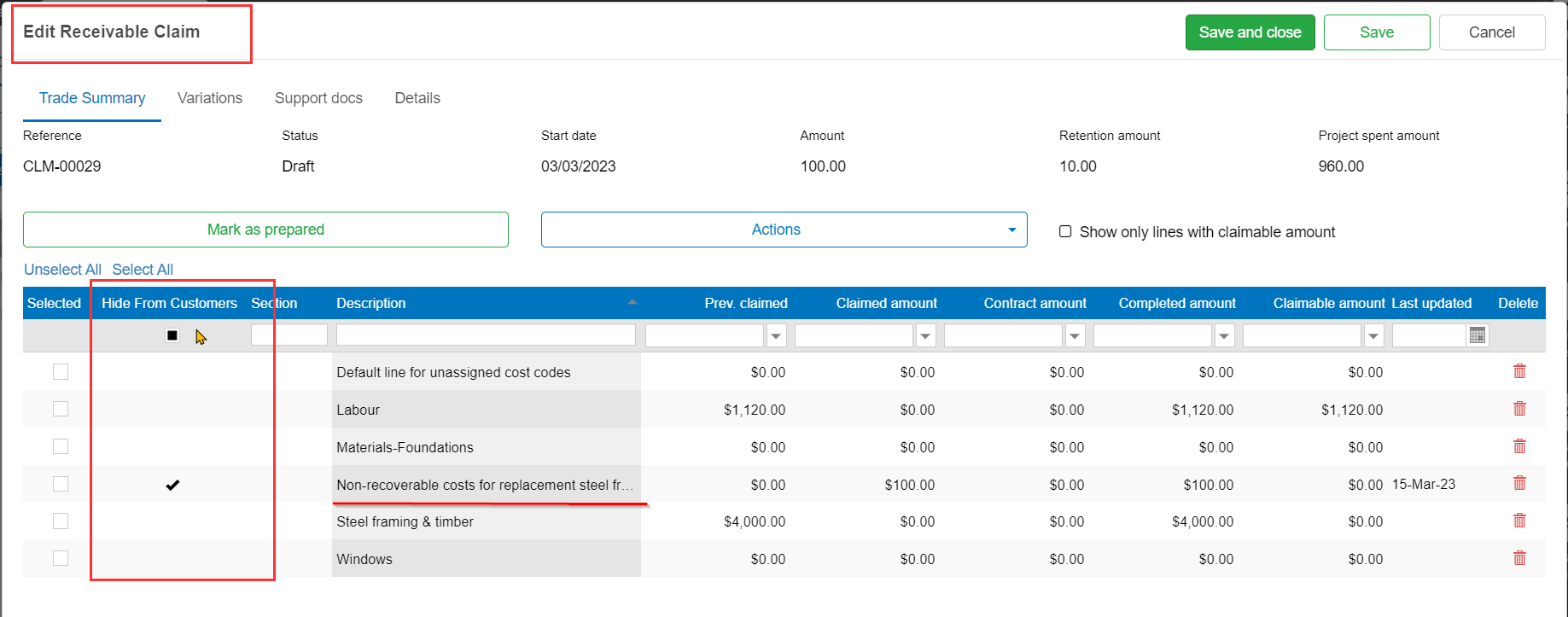 When you create your Claim, you can see any lines that have been marked as Hide from Client. They will have the field Hide from Customers checked. These Trade Summary and Variation lines will not be included in your claim and will not be included when you Generate Cost Plus Supporting Documents from the Claim screen.