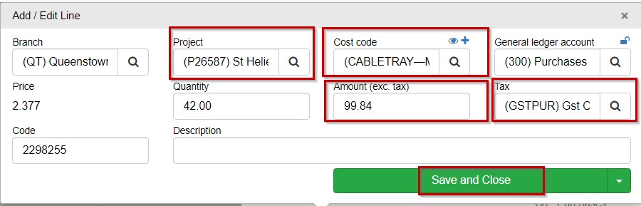 Check the Amount (Excl. Tax) and Tax code for the line. The Tax code will automatically populate based on the General Ledger code selected.